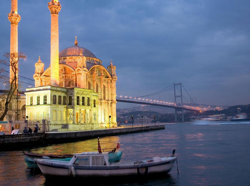 وقت الغروب ستندهش من المنظر الرائع لأشعة الشمس التي تسبح وسط الأمواج بمضيق البوسفور و مسجد اورتاكوي في منظر ساحر.